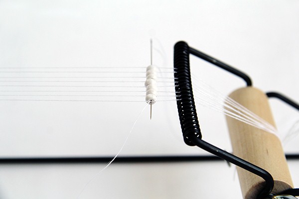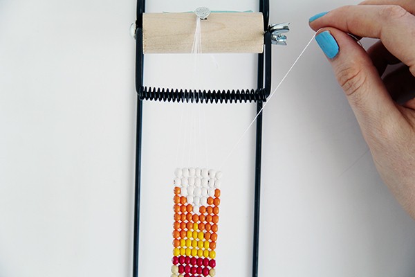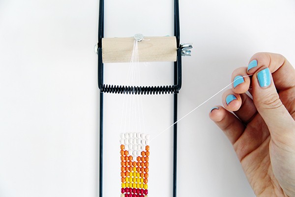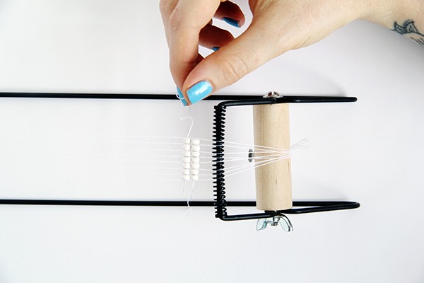 По-перше, нам потрібно налаштувати нитки основи (ті, що прикріплені до ткацького верстата). Визначтеся із шириною вашого виробу. Ми вирішили сплести смугу завширшки сім бусин (якщо ви хочете створити трикутні форми, завжди використовуйте непарне число, щоб ви отримали точку «одніє намистини» в середині). Потрібно додати одну до числа бісеринок - це буде тією кількістю ниток основи, яка вам потрібна.
