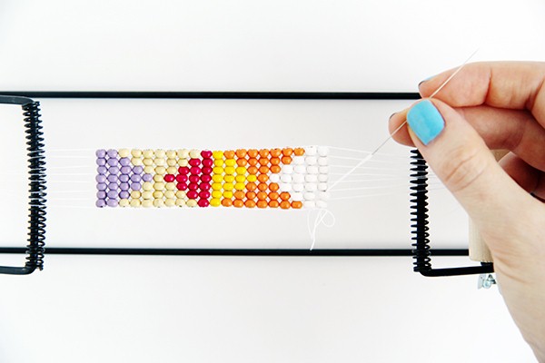 Коли ви завершите плетіння зразка, потрібно зняти його зі верстата. Цей момент важливо запам'ятати! Якщо ви неправильно нанизуватимете свої нитки основи, вся робота, яку ви проробили при створенні візерунка, розвалиться, і у вас залишиться щось хаотичне! Спочатку протягніть нитку качка (голку) назад і вгору через намистинки, щоб закріпити їх разом.