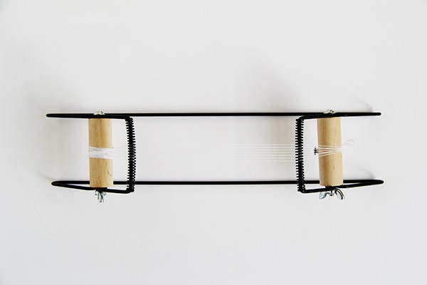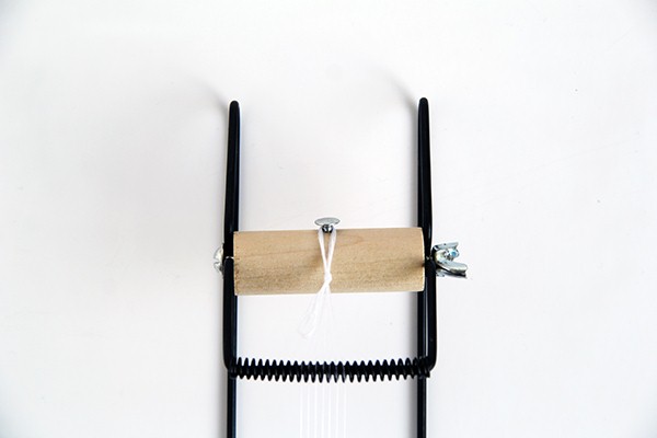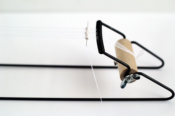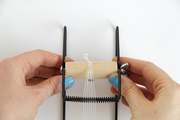 Зачепіть петлі за дерев'яні бочки на верстаті та поверніть, щоб затягнути нитки та створити натяг. Розподіліть кожну з ниток по окремих осередках на котушках між бочками. В'язальний гачок – дуже зручний інструмент, який допомагає розділити нитки.
