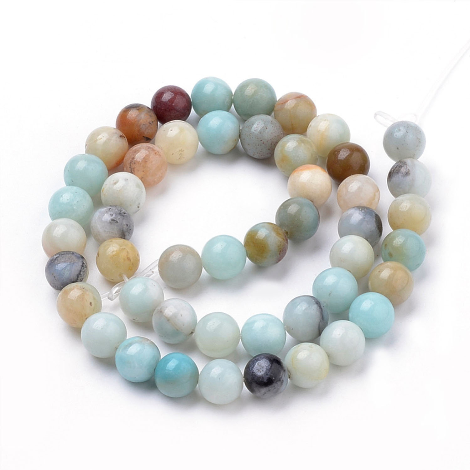 Амазоніт – це один найдешевший камінь, оскільки належить до класу польових шпатів. Забарвлення цього мінералу може змінюватись від зеленого, то блакитно-зеленого відтінку. Також є амазоніт з білим відтінком та вкрапленнями різного кольору. Намистини з нього віддають скляним блиском.