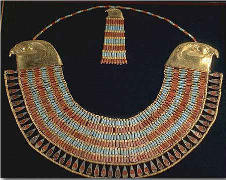 У Єгипті знайдено й чудові намисто з фаянсу, який виготовляли із кварцу. Його подрібнювали в дрібну крихту, формували та покривали шаром кольорового скла. Такі намистини були непрозорими і імітували коштовне та виробне каміння. За допомогою мідних, марганцевих, залізних і свинцевих сполук скло фарбували в коричнево-червоні, зелені та сині тони.
