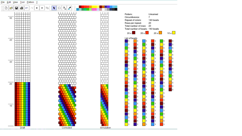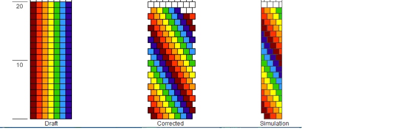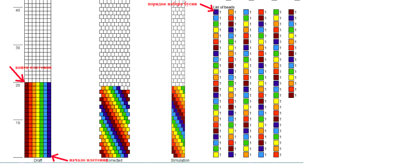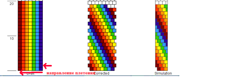 Тепер звернемо увагу на кольорові стовпчики, що імітують плетіння та займають ліву частину нашої схеми. Кожен із стовпців має своє значення. А саме: "Draft" - є схемою малюнка джгута в розвороті. "Corrected" показує, як виглядатиме візерунок у самому плетінні. А Simulation зображує вигляд готового джгута.