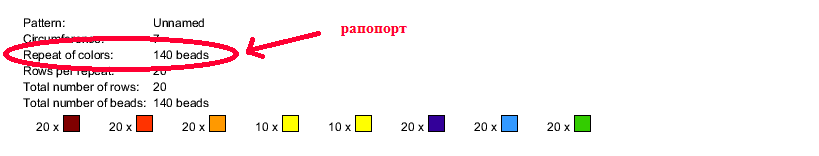 Отже, наша схема створена за допомогою спеціальної програми на комп'ютері і говорить вона про те, що нам знадобиться бісер семи кольорів: коричневий, помаранчевий, коричнево-жовтий, жовтий, зелений, блакитний та фіолетовий. Основа джгута складається також із 7 бісеринок, а далі ми дивимося на власне схему плетіння.