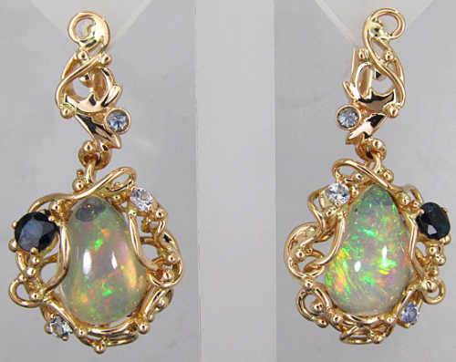 Чи не вибагливий опав камінь, як носити його особливих рекомендацій немає. Але найкраще, якщо це буде пара. Наприклад, кольє та сережки або гарнітур. Такий мінерал, що іскриться, дає можливість ювелірам і рукоділкам створювати дивовижні по красі вироби. Інші камені лише знаходять додаткову витонченість поруч із сяючим опалом. Підходить практично всім знаків. Але Овнам і Левам варто обережно ставитися до подібних виробів. На фото представлені золоті вироби, де опал сусідить із чорним агатом та фіанітом.