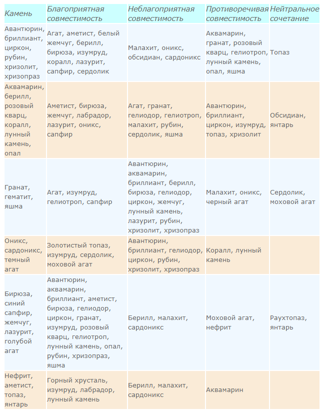 Вважається, що можна поєднувати будь-які вироби із самоцвітів. Важливо аналізувати власний стан, коли використовується прикраса. Міцне здоров'я, піднесений настрій, успіх у справах та любові свідчить про те, що прикраса та камінь обрані правильно. Для кращого розуміння того, що і з чим можна носити, наведено таблицю. Не слід брати цю інформацію за основу. Кожна людина індивідуальна. Тому єдиних критеріїв сумісності просто нема.