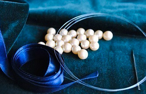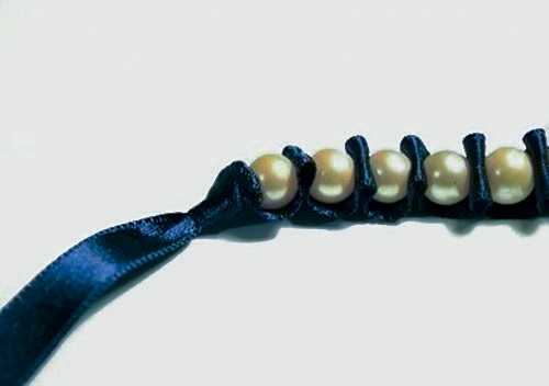 Одна з труднощів, з якими ви можете зіткнутися, це неслухняність намистин. Атласні стрічки слизькі, і намистини не одразу вкладаються між ними — вислизають. Тому спочатку знадобиться трохи вправності, щоб добре закріпити її.