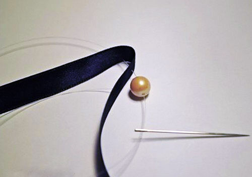 Беремо одну з намистин, пропускаємо через неї голку та прикріплюємо до стрічки. Тепер потрібно обхопити стрічкою намистину і зробити таку ж складку, як на початку.