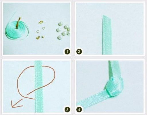 Спочатку готуємо стрічку до роботи, для цього потрібно припекти один її край запальничкою, потім загнути виворітною стороною всередину приблизно на 1 см (щоб за розміром був, як намистина).