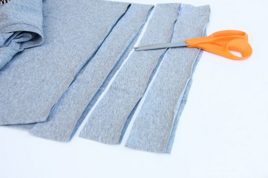 Наріжте з футболки 3 або 5 смуг однакової довжини (відрізайте упоперек футболки, починаючи з низу).