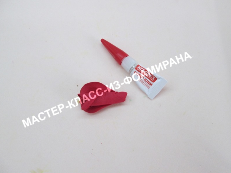 На край першої пелюстки нанесіть клей і скрутіть його – це буде основа троянди.