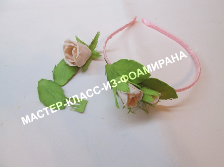 Виріжте з оливкового або зеленого фоамірану 8-9 листочків (можна різної величини), нагрійте праскою, а потім відіжміть на молді. По кілька листків наклейте на літони – так листочки будуть надійніше триматися на обідку.