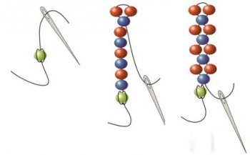 2. Нанижіть бісер, орієнтуючись на схему перших 2-х рядів, а потім – 1-у бісерину з третього ряду. Протягніть їх ниткою до бісеринки-стопора. Просуньте голку через 3-ю бісеринку від голки (на малюнку вона синя), направляючи голку до бісеринки-стопора.