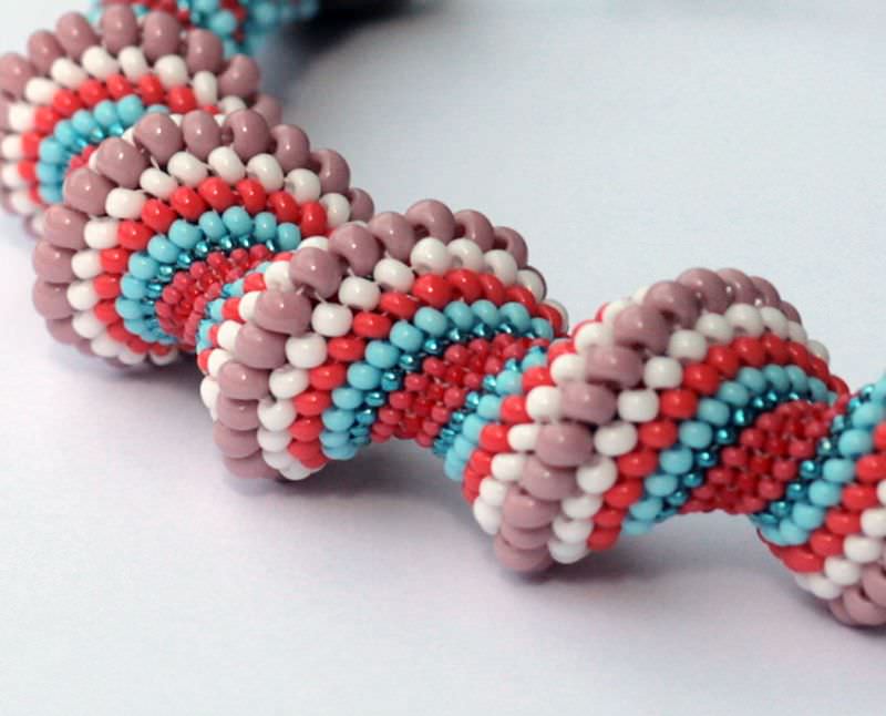 3. Надягніть наступну бісеринку 3-го ряду, протягніть голку через 2-ю бісеринку від голки (також синю), прямуючи на бісеринку-стопор. Дійте за цією схемою до закінчення ряду. Бісерна кромка смужки, що вийшла, повинен бути схожий на цегляну кладку, в якій червоні бісеринки виступають, а сині - відступають. Не переживайте, якщо смуга спочатку надто перекручуватиметься: у міру додавання наступних рядів, вона ставатиме жорсткішою і розпрямлятиметься.