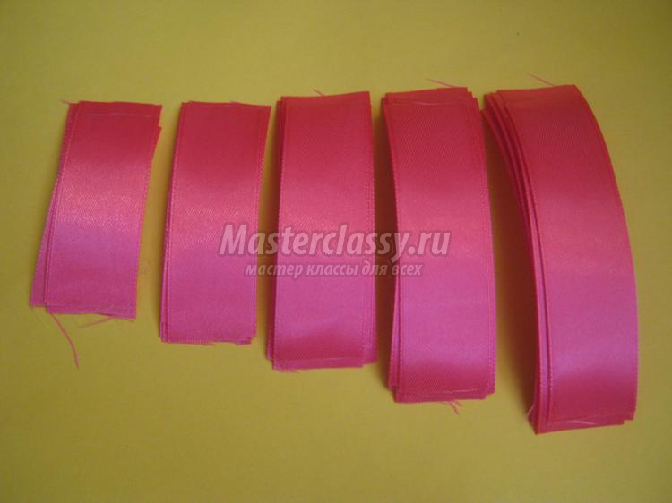 Для виготовлення пелюсток наріжте стрічку на відрізки: 5 шт. завдовжки 60 мм, 5 шт. завдовжки 70 мм, 8 шт. завдовжки 80 мм, 10 шт. по 90 мм та 15 шт. по 100 мм.