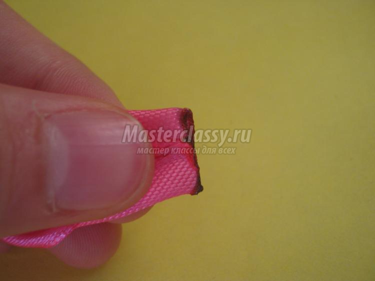 Загніть обидва куточки і проведіть кінцями стрічки біля свічки і спаяйте краї так, щоб вийшла пелюстка. Зробіть так само пелюстки з усіх відрізків стрічки і складіть їх у купки за розмірами.
