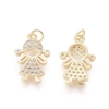 Ці витончені підвіски виготовлені з якісної латуні, інкрустовані прозорим фіанітом (кубічний цирконій) для елегантного блиску. Дизайн у формі дівчинки робить їх ідеальними для дитячих прикрас або виробів із ніжним, символічним змістом. Гладке золотисте покриття додає теплоти й вишуканості.