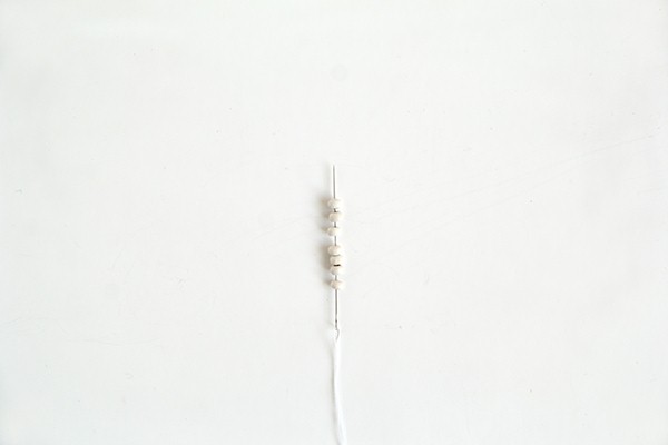 Нанижите первый ряд бисеринок на иглу. Не перемещайте их вниз на нить. Просто пока держите их на игле.