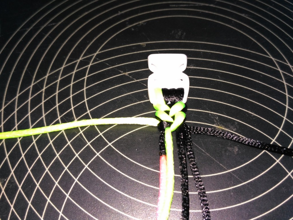 Паракорд нужно сложить пополам и протащить через отверстие застежки так чтобы в итоге образовалась петля. Свободные концы шнура протягиваются через образовавшуюся петлю и плотно затягиваются. Получается первый узел. Затем нужно одеть вторую застежку (так, чтобы было удобно потом застегивать) и отмерить нужный размер шнура по размеру запястья.
