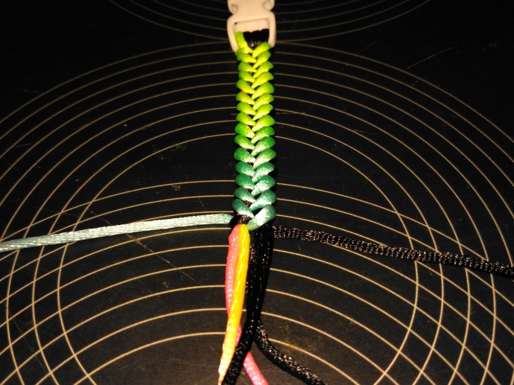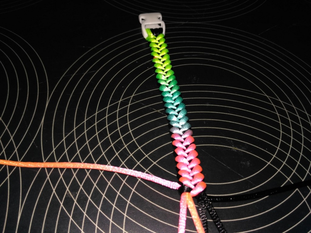 Дальше нужно продолжать плетение по такой же схеме до самого конца, пока не получится полноценный браслет. Затем оставшиеся концы шнура нужно протянуть через отверстия застежки и опалить зажигалкой, чтобы не распустились.