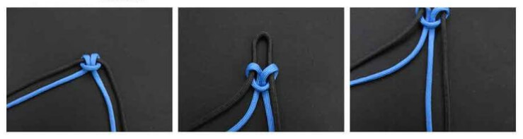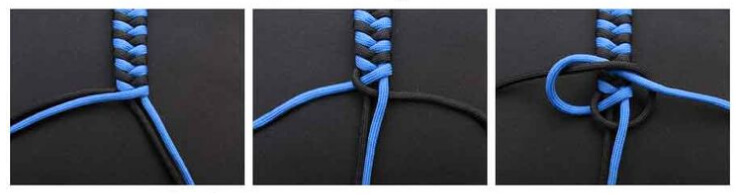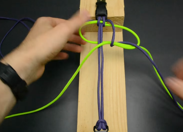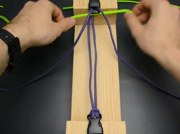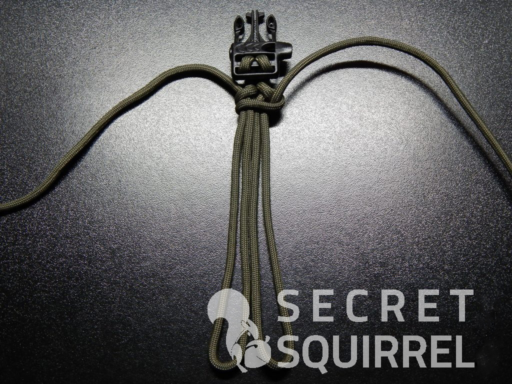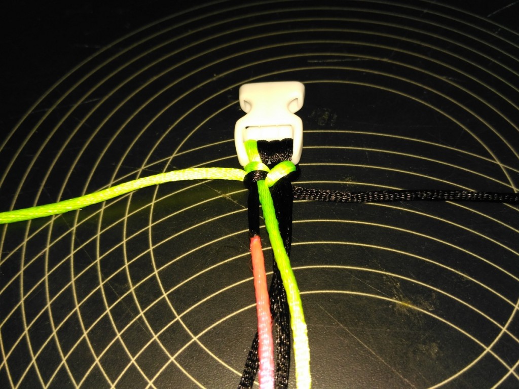 Отрезок паракорда нужно сложить пополам, сформировав виток и сделав узел вокруг выбранной застежки. Затем нужно отмерить нужную длину шнура и обвести его концы вокруг второй застежки. Затем начинается само плетение.