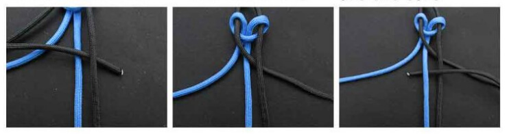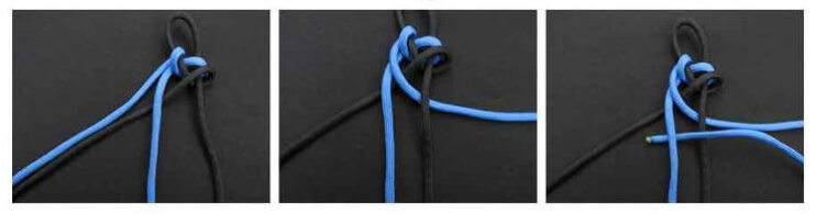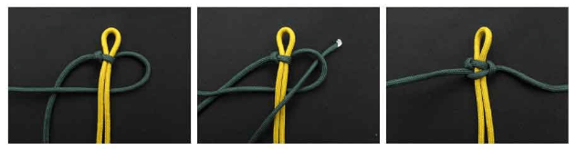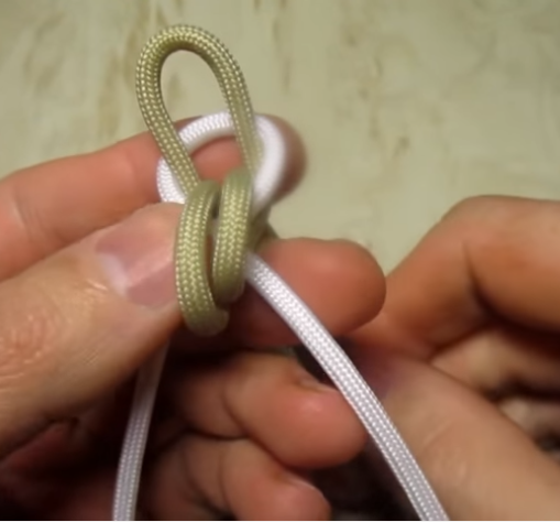 Левую веревку нужно положить поверх шнура-основы и повернуть оба конца веревки так, чтобы справа образовалась петля. Затем правым витком веревки нужно обогнуть левый вверху, а конец левого витка пропустить в петлю снизу вверх. Теперь остается только потянуть за два конца шнура и сформировать узел.