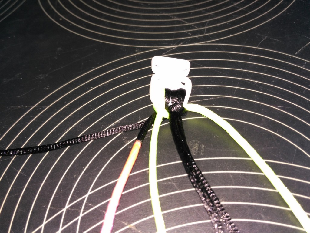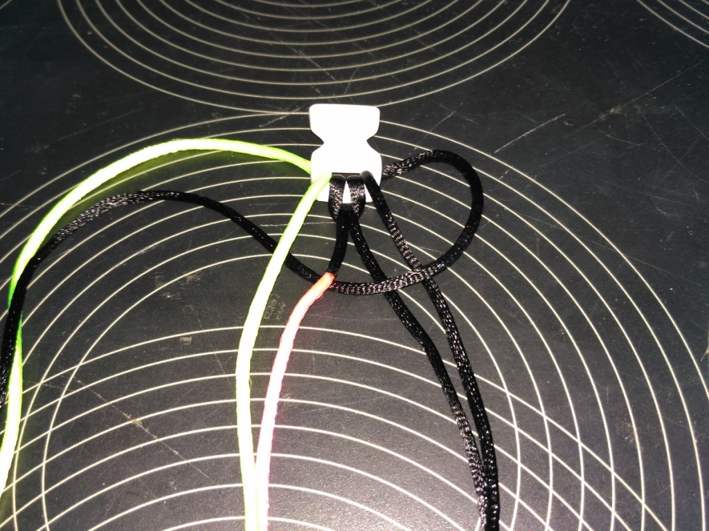 Довольно необычное, но простое плетение. Понадобится один шнур (или два разного цвета, спаянных в один) и две застежки. Традиционно из шнура формируется петля и продевается через застежку, затягивается. Затем шнуры протягиваются через застежку с противоположной стороны.