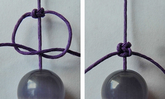 После создания трех узелков нам нужно оплести бусину. Для этого следует повторить манипуляции, проиллюстрированные на фото, то есть, обрамить ее шнуром с обеих сторон и затянуть его на 2 узелка: