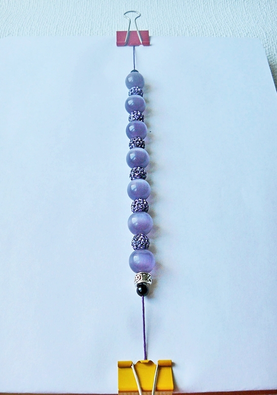 6 бусин поменьше, которые призваны оттенять основные бусы или контрастировать с ними. В нашем случае были использованы небольшие фиолетовые бусинки, покрытые стразами;