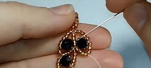 3. Иглу ввести одновременно в 4 бисерины, протянуть нить и нанизать бусину. Закрепить ее внутри кольца, используя 4 противоположных бисерины.