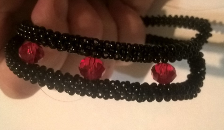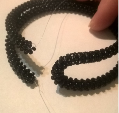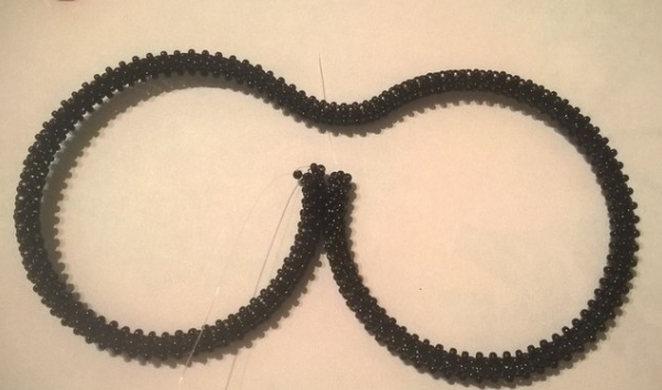 1. Из бисера и мононити сплести жгут такой длины, чтобы внутри разместились оба отрезка проволоки. Плетение жгута крестиками рассматривались в предыдущих статьях.