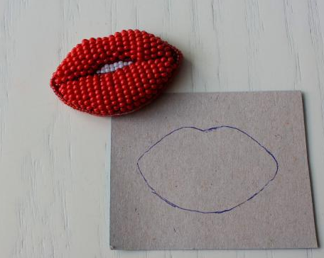 Брошь губы из бисера готова! Теперь ее можно прикрепить на пиджак или сумочку. Это не единственный вариант. Если после прохождения контура на внутреннюю поверхность приклеить по кусочку фетра, которые совпадают с губами, можно сделать объемную брошку, где губки приобретут естественную припухлость.