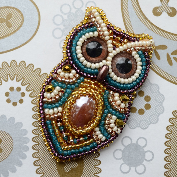 А тем, кто уже знаком с бисероплетением, можно сплести фигурку совы и, аналогично вышитой картинке, прикрепить ее к застежке.