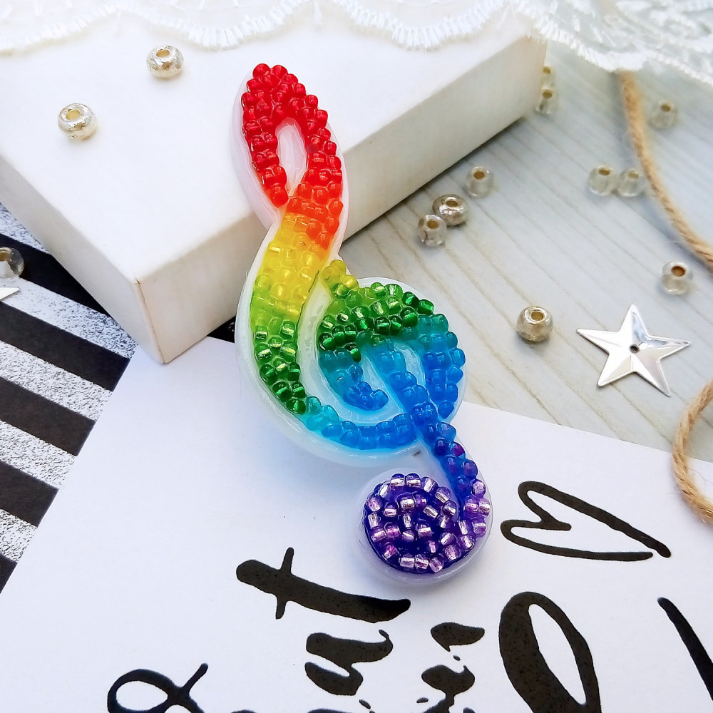 Музыкальная тематика также вдохновляет рукодельниц на создание очень своеобразных брошей из бисера. Такой аксессуар будет подчеркивать возвышенность вашей натуры, вдохновлять на творчество. Скрипки, гитары, саксофона, знак скрипичного ключа имеют грациозные очертания и из их изображений получаются очень утонченные броши.