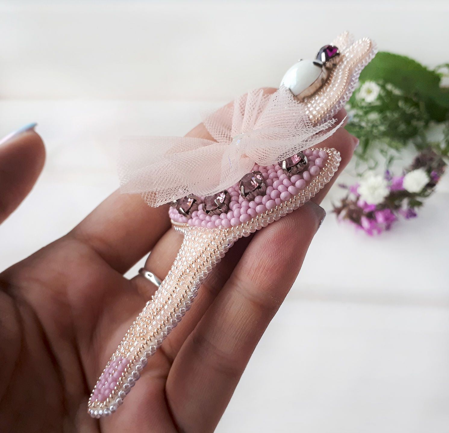 Такая брошь из бисера смотрится оригинально в принципе, поэтому ею можно внести элемент неожиданности в самые разные по стилю ансамбли. Она будет манифестом женской грации, утонченности, гармонии.