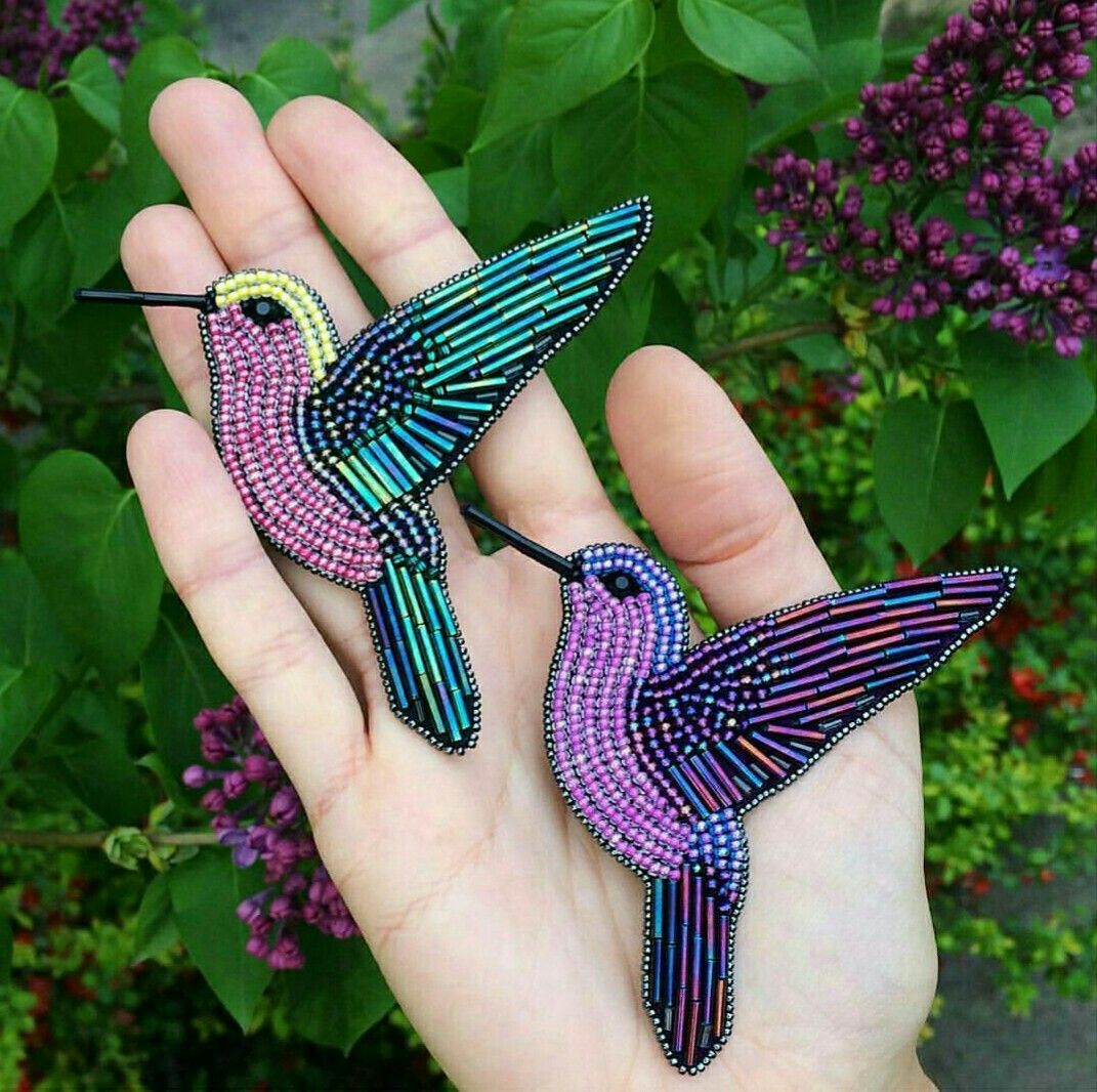 Очаровательную брошь в виде колибри можно сделать с помощью вышивки бисером на фетре или коже. В самом простом варианте выполняется из 2-3 оттенков. Каждая бисеринка играет функцию пятнышка на крыле и может быть как разной формы, так и разных цветов. В целом образ колибри создает романтическое настроение, делает наряд более утонченным и изысканным.