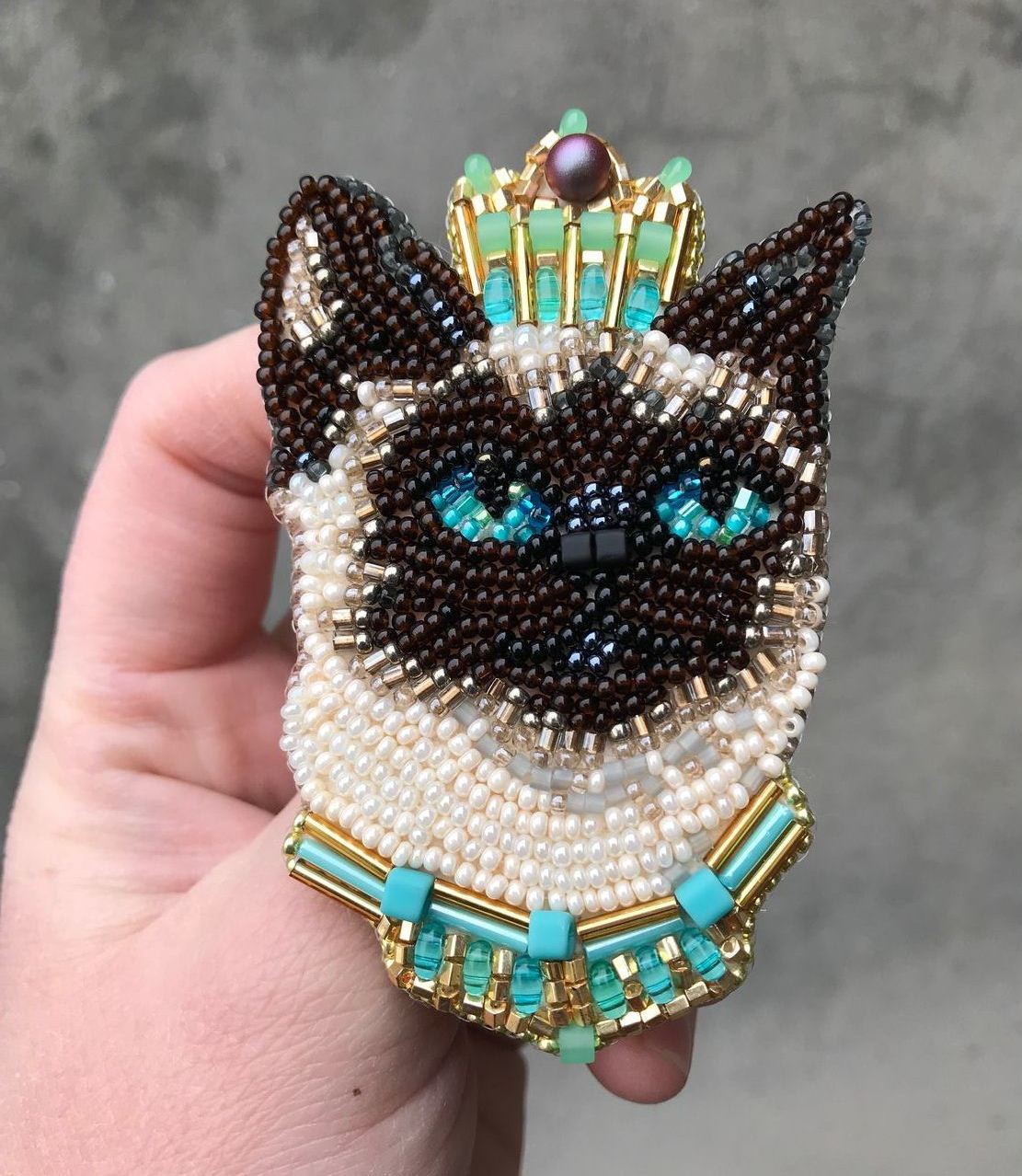 Грациозная черная кошечка, вышитая черным и золотистым бисером, с крупным кабошоном и бусинами, привнесет загадку в ваш облик и не останется незамеченной.