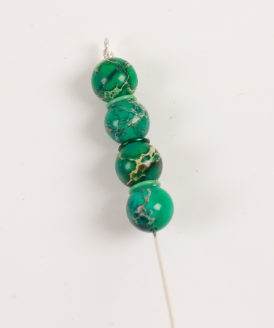 3. На подготовленную проволоку надеть бусины из варисцита, вставляя между ними декоративные колечки зеленого цвета.