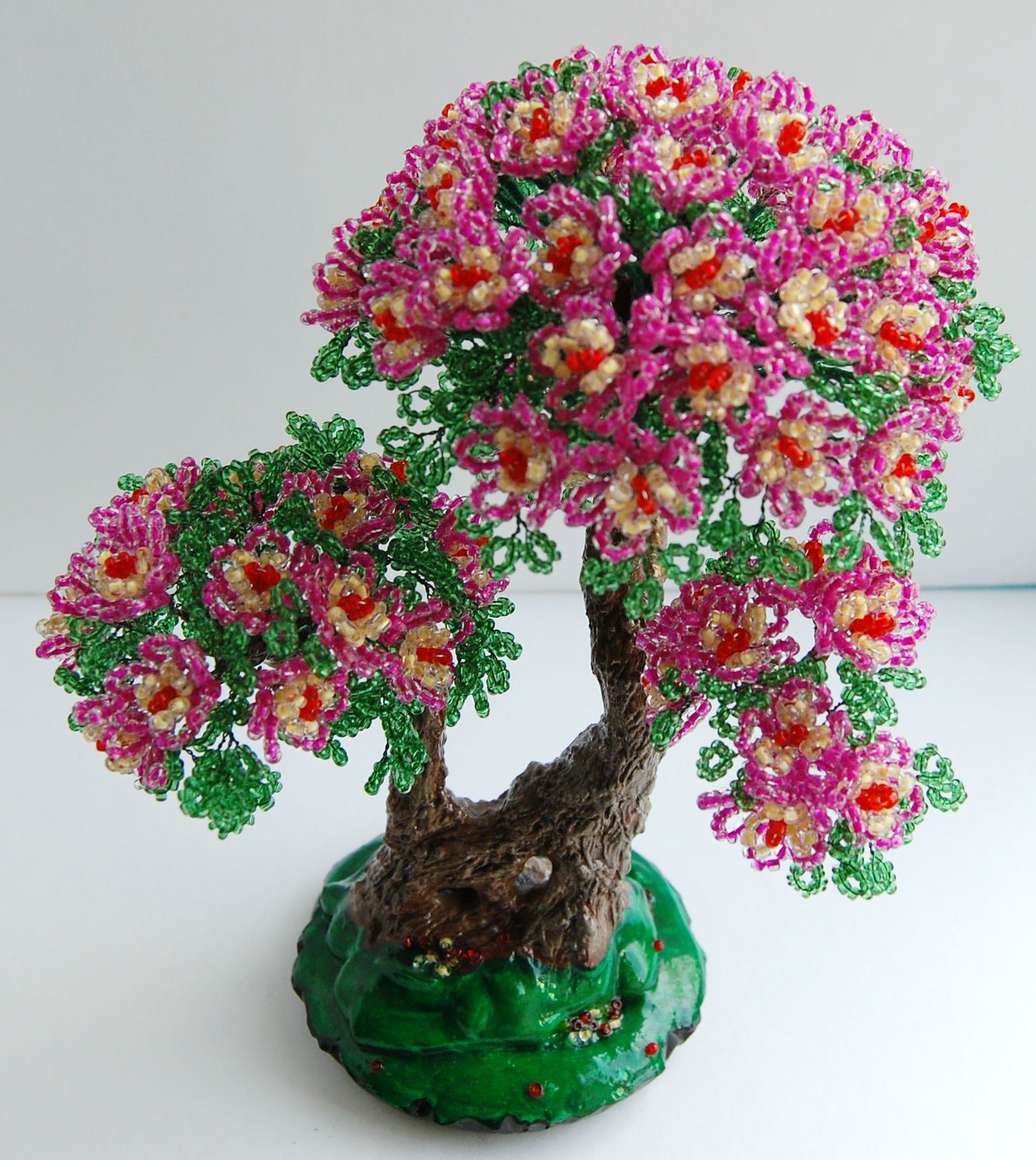 Сейчас активно развивается и становится все более популярной технология создания флористических композиций и маленьких деревьев из бисера. Будучи изготовленными из миниатюрных и блестящих бусинок, такие изделия выглядят оригинально, а иногда и вовсе как «живые» растения, только в миниатюре, подобно японскому дереву «бонсай».