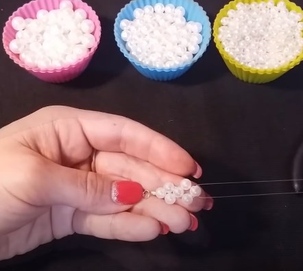 Теперь нужно взять 3 бусины и продеть через них леску. Затем продеть иглу в четвертую бусину основы и протянуть сформируется треугольник и первый элемент подвески.