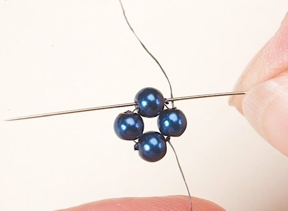 Последовательность повторяется: продеваем 3 бусины, натягиваем, продеваем иглу через 4-ю бусину и снова протягиваем. И так до конца первого ряда.