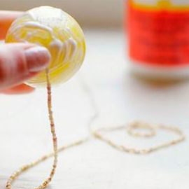 Одиночная нить, унизанная бисером, просто накладывается плотными витками на яйцо, покрытое клеем. В этом случае вовсе не важно, с какого места начинать обклеивание. Здесь главное — хорошенько закрепить, приклеив конец нитки.