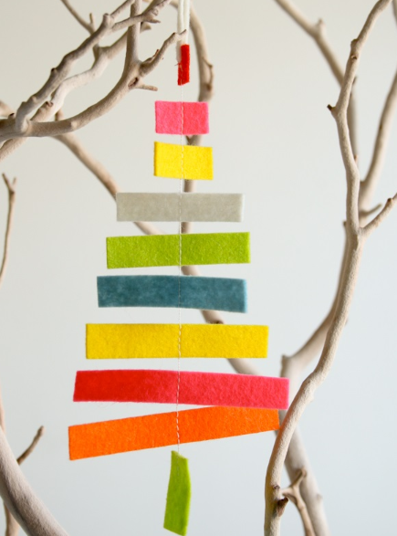 Необходимо вырезать несколько полосок из разноцветного фетра. Прострочить их ровно посередине. Используйте фетр с блесками. Так елка будет смотреться более празднично.