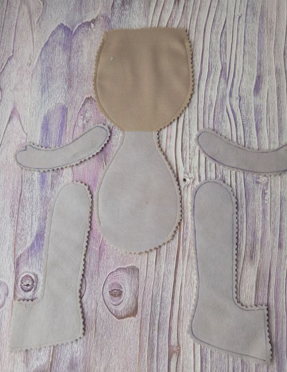 Для изготовления туловища лучше использовать трикотаж. По такой же выкройке изготовляются вязаные куклы своими руками. Для того, чтобы ткань не тянулась и стала более прочная, с изнаночной стороны ее проклеивают флизелином. Дальше действовать по инструкции.