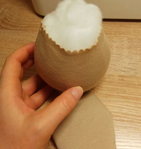 4. Теперь можно сделать голову. Понадобится шарик для тенниса. Вырезать круг из синтепона, чтобы он полностью закрыл шарик и засунуть его в заготовку для головы.