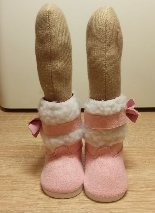 7. Заготовки для ручек и ножек набить таким же образом, используя палочку или спицу. Зашить. Если обувь заготовлена заблаговременно, то удобнее вставить в нее ножки еще до набивания.