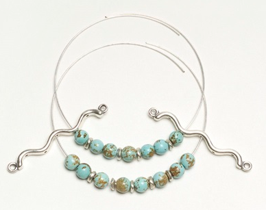 6. Далее браслет с бирюзой своими руками выполняется так же, как в предыдущих шагах. Через одинаковое количество бусин, надевать очередной волнистый стержень. В данной работе после стержня добавлены кристаллы из горного хрусталя. Это не принципиально, но браслет смотрится богаче.