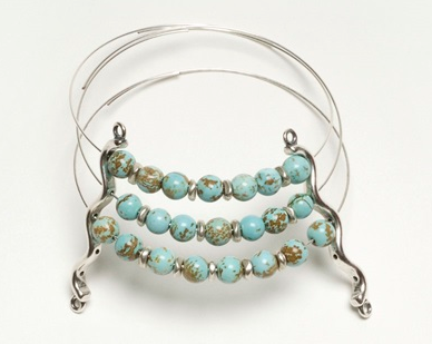 Простые женские часики более оригинально будут смотреться с бирюзой. В работе использовались две проволоки с памятью и бирюзовые бусины. Работа выполнялась по принципам, предложенным выше.