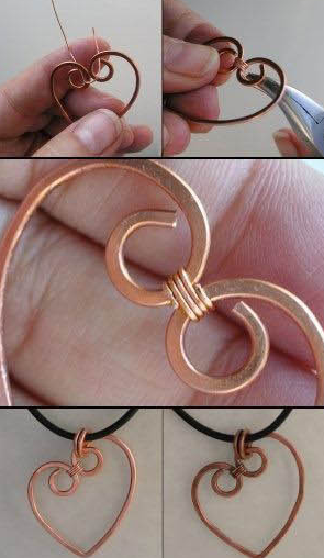 11. Более тонкой проволокой обвить, соединив два кругляшка. Отдельно свернуть колечко и присоединить его к сердечку.