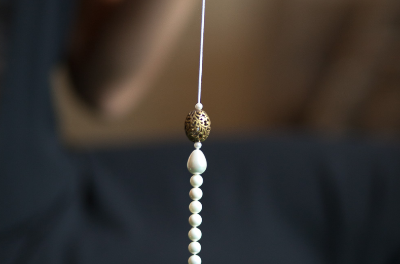 4. Когда все три ряда жемчужин присоединены к колечку, закрепить цепочки, тогл или карабин.