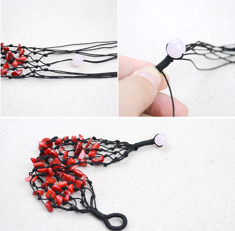 3. Одягати намистини на кожен окремий шнур у шаховому порядку та закріплювати їх за допомогою чергових вузликів.